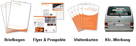 Konzeption, Gestaltung und Realisierung von Geschäftsdrucksachen und Werbemitteln wie z.B. Visitenkarten, Briefbogen, Formularen, Broschüren, Katalogen, Plakaten, Flyer, Kfz-, Gebäude- und Schaufensterbeschriftungen. Dabei achten wir auf die strikte Fortführung Ihres bestehenden Corporate Design.